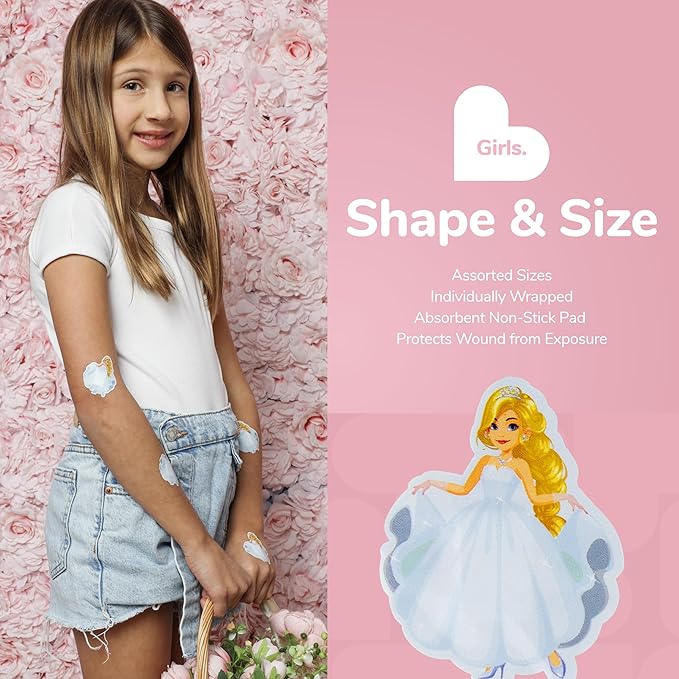 - ASSORTED BANDAGES: This 100 piece pack of adorable assorted girls bandages is great for putting a smile on kids' faces while protecting wounds such as cuts, scrapes, and burns, and come in 10 assorted styles (donut, kissy face, lips, cat, heart, flamingo, mermaid, cinderella, unicorn, and sunflower); sticky bandages are perfect for kids and adults alike, and also for school nurses and pediatric doctors