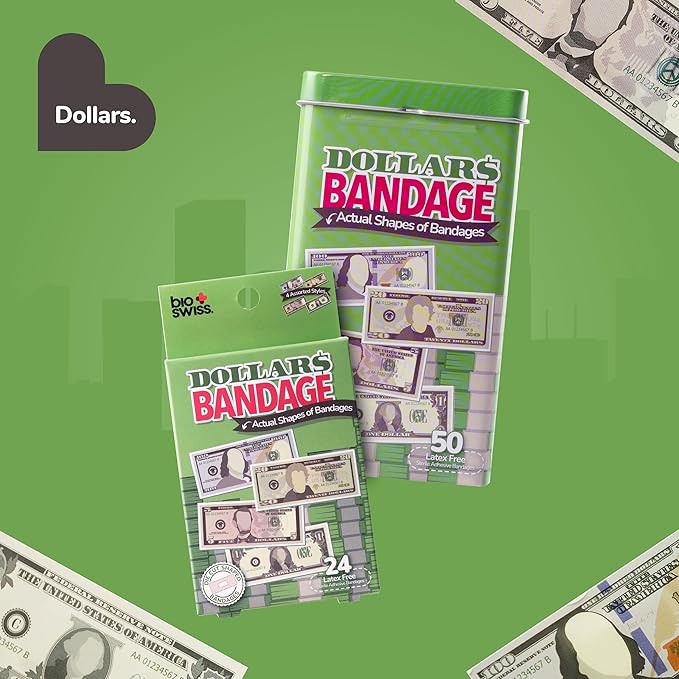 - MONEY BANDAGES: This 24 piece pack of adorable dollar bill shaped bandages is great for putting a smile on kids' faces while protecting wounds such as cuts, scrapes, and burns; sticky bandages are perfect for kids and adults alike, and also for school nurses and pediatric doctors