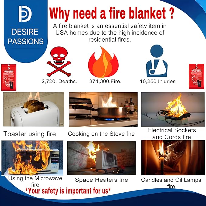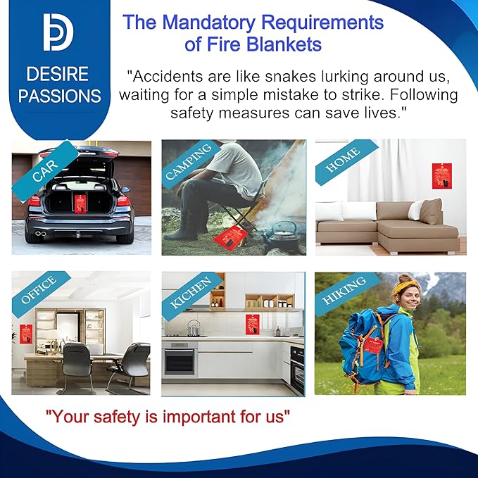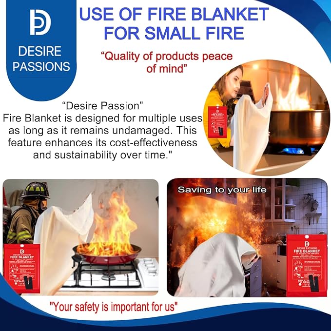 - 🔥 Quality Assured:Desire passions designed as emergency prepared home-safety device for peace of mind. Keep the fire blanket for home in the kitchen, backyard, fireplace, grill, office, camping or vehicle fire survival kit for protection it is also use in industrial fire. Never compromise on quality of fire blanket.