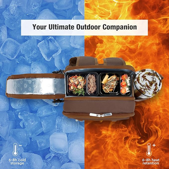 • LARGE CAPACITY & WELL EQUIPPED: Size: 12(L)x7.5(W)x16(H) inches, 5.3 lb; The 24L high-capacity picnic backpack big enough to accommodate the ingredients needed for a picnic. Includes a full set of meal preparation tools, thickened waterproof picnic mat, wine bag, and we exclusive gift internal detachable waterproof preservation layer. The bag is made of 600D Oxford fabric and 5mm PE foam and PU layer, which can keep the hot/cold/fresh for hours.