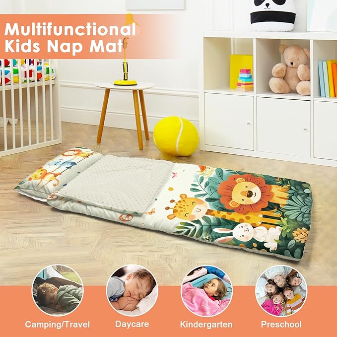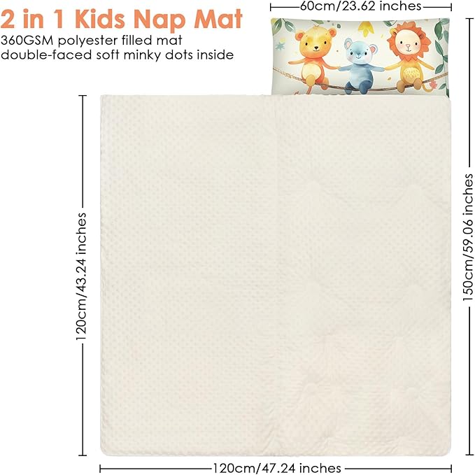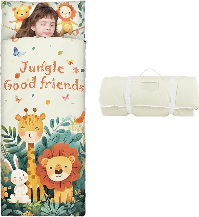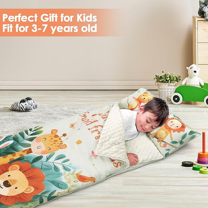 - Suitable Size and Thickness: Our child sleeping bag is 59 x 24 inches in full size; the mattress quilt is filled with 360gsm cotton and the cover is 80gsm.The pillow is 200g.Large size and thickened weight are very suitable for children's napping, bringing them an unforgettable sleeping experience.
