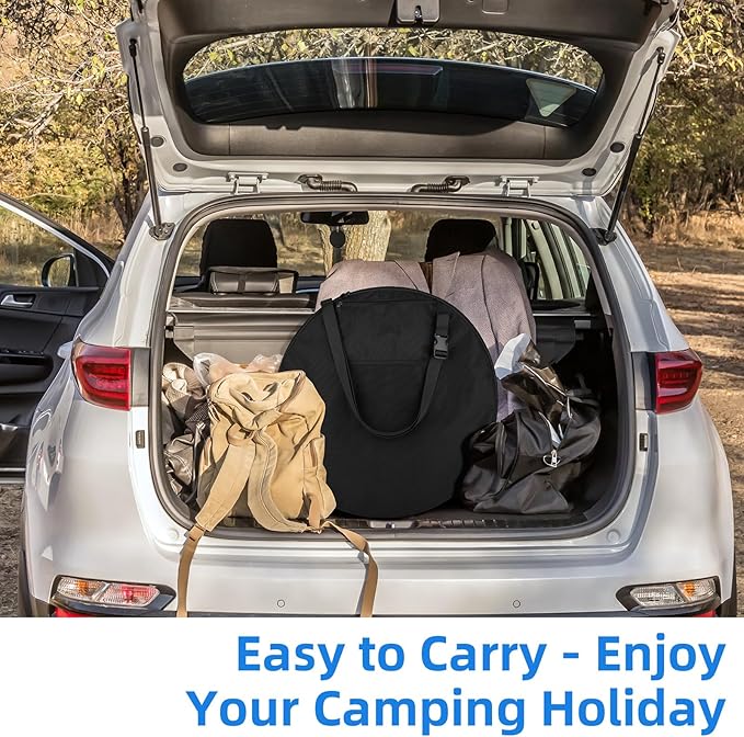 - Convenient Carry Bag: This pop up shower tent storage bag has large zipper mouth for easy portability and convenient storage. This collapsible pod can fit under the seat of a truck, in a car trunk, or in a beach tote when you’re on the go.