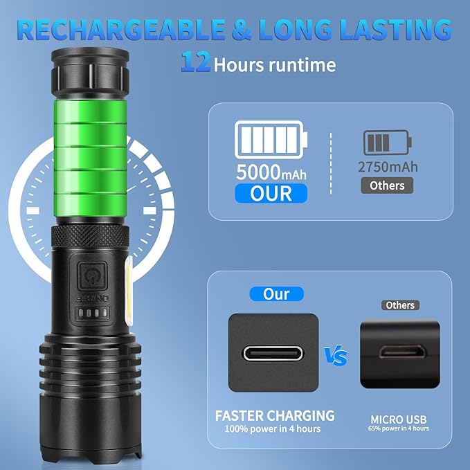 - 🔦[12 Hours Long Life Time & Quick Charge] Rechargeable flashlight with upgraded performance and up to 12 hours of illumination time. With USB fast charging mode, 3 times faster charging than traditional micro charging port, fully charged in 3-4 hours. Four blue indicator lights show the power level (25%, 50%, 75%, 100%).
