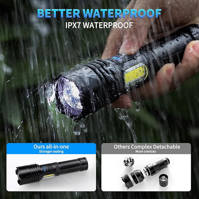 - 🔦[Ipx7 Waterproof & Aluminum Alloy Material] The flashlight is IPX7 waterproof and can be used normally even when facing heavy rain outdoors. The case is made of high-strength aluminum alloy material and comes with a non-slip grip, refined and durable.