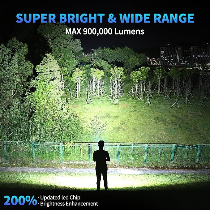 - 🔦[900,000 High Lumens & Brightness] Super bright flashlight uses the latest LED chips to output up to 900,000 lumens.LED flashlight is 20 times brighter than a regular incandescent bulb, and can light up the area of a soccer field, illuminating a distance of up to 3,280 feet.