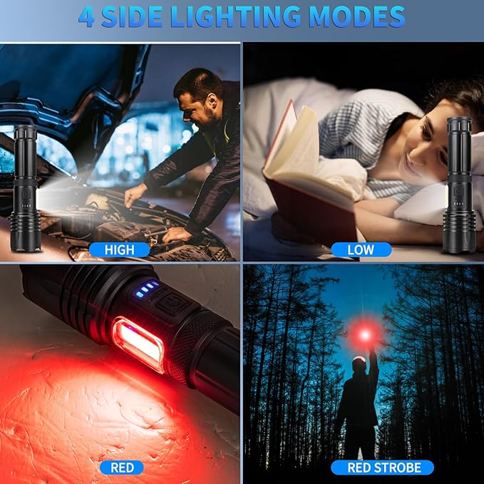 - 🔦[7 Light Modes & Adjustable Functions] 3 main lighting modes (high/medium/strobe) + 4 COB modes (high/medium/red/strobe). Quickly press the on/off button twice to switch to COB mode, long press for 2 seconds in any mode to turn it off directly. Pull the flashlight head to select wide range lighting or long range lighting.