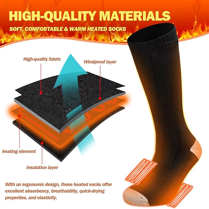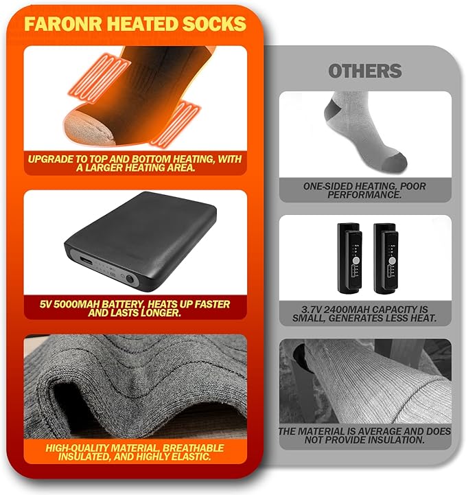 - Stay Cozy All Winter with FARONR Heated Socks: Whether you're skiing, hiking, or simply braving the cold, our heated socks provide unmatched warmth. Perfect for both men and women, these heated socks for men and women ensure your feet stay toasty in any outdoor activity