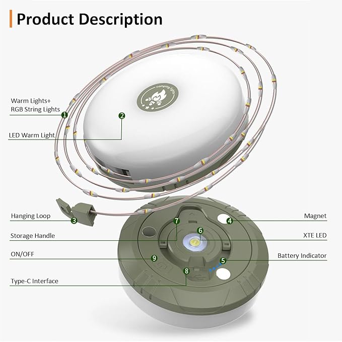 - 8 Lighting Modes — This camping string lights has 5+3 different lighting modes, including String Lights Warm Light, String Lights RGB Alternate Flashing, String Lights RGB Breathing, SMD Warm White+String Lights Warm Light, SMD Strong Light. Long press and hold the button for 3 seconds to enter the XTE light mode: XTE Strong Light, XTE Weak Light, XTE Flash. Press the switch to turn off after 8 seconds in any mode.