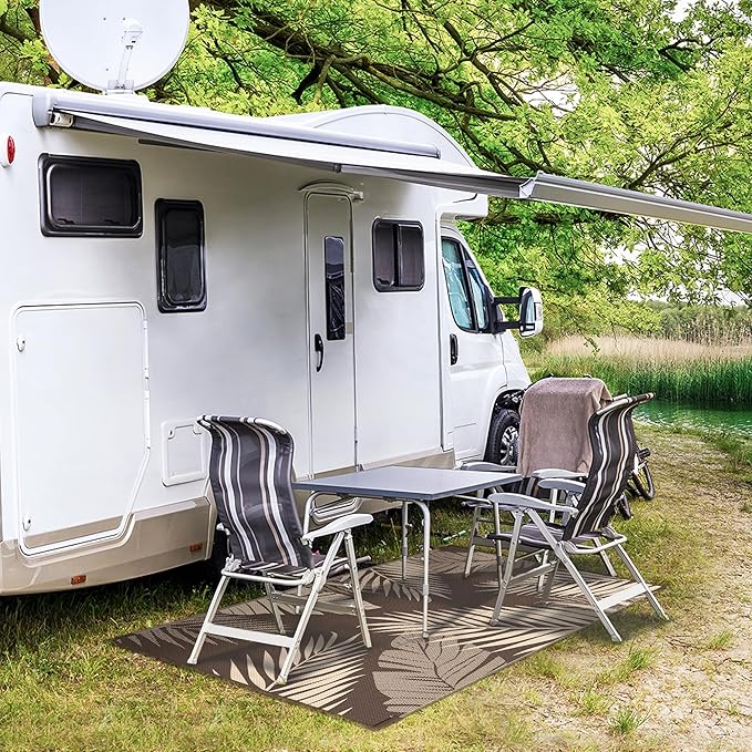 - Perfect Choice For RV Camping: Woven from lightweight plastic straws, these RV outdoor rugs can be easily folded down to a compact size to fit in our included carry bag. This portable waterproof outdoor rug allows you to take it outside easily, and also designed 4 corner loops with 4 stakes to help fix the carpet in place. Using this camper rug will relieve all the burden and fatigue of your RV trips and camping, allowing you to have plenty of imaginable space for more fun