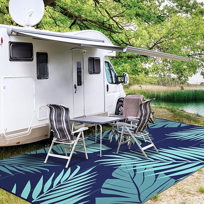 - Perfect Choice For RV Camping: Woven from lightweight plastic straws, these RV outdoor rugs can be easily folded down to a compact size to fit in our included carry bag. This portable waterproof outdoor rug allows you to take it outside easily, and also designed 4 corner loops with 4 stakes to help fix the carpet in place. Using this camper rug will relieve all the burden and fatigue of your RV trips and camping, allowing you to have plenty of imaginable space for more fun