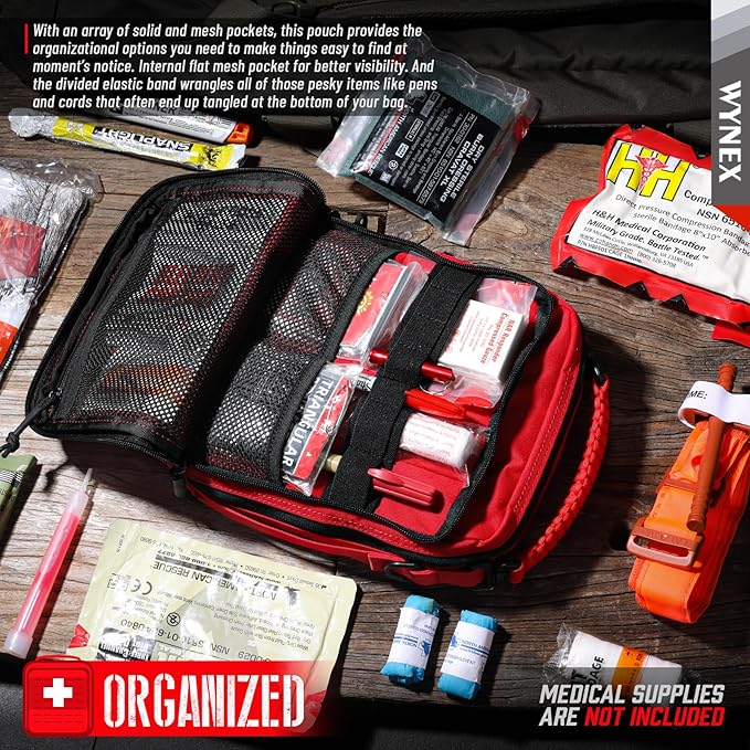 - VISIBILITY: Medical Bag's front compartment has zipper/open ventilative see-thru mesh pockets that are handy for small things which won't fit as well in the elastic cord, yet provides efficient access to the supplies you need. Securely stow your multitools, medical supplies, flashlight, and more with internal divided elastic loops. Keeping your gear neat and in one place, not five minutes after rummaging through your entire pouch.