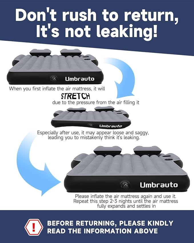 - Don't Rush to Return!: When people first use air mattress, they may mistakenly think it is leaking because it stretches due to the pressure of air filling it. Please inflate the mattress to full again to allow it to expand. Repeat this process for 2-3 nights until the air mattress fully expands and settles in.