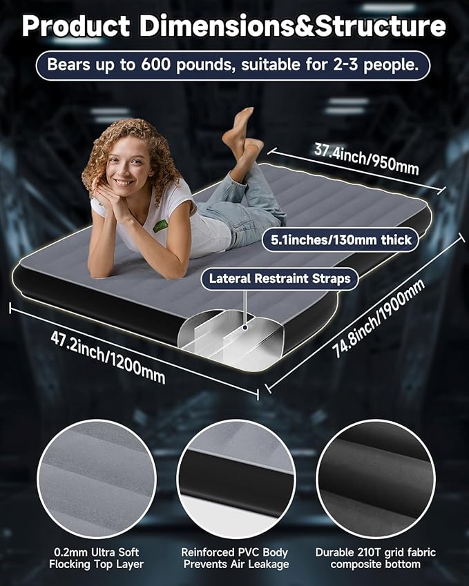 - High-Quality Materials: The Umbrauto inflatable air mattress features a plush soft-flocked top surface, durable PVC construction for robust support, and upgraded 2024 extra-thick 210T grid fabric on the bottom to prevent punctures and air leakage, enhancing durability and reliability.