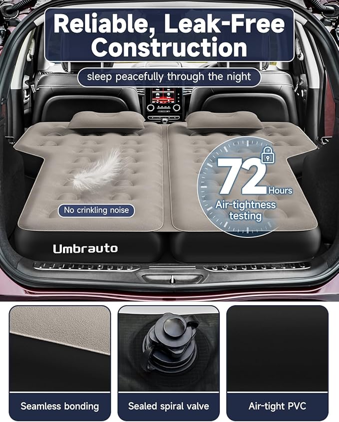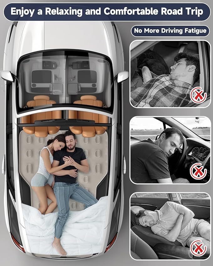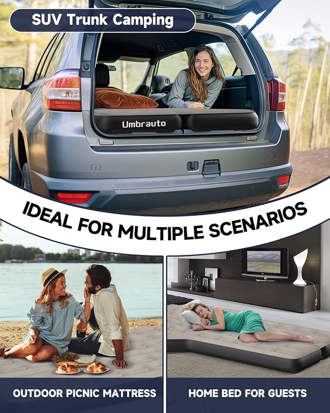 - Versatile Usage: This inflatable air mattress features a 2-chamber design that can be fully inflated to create a spacious sleeping bed for multiple people in SUV trunks, or used as a tent mattress or camping mattress outdoors. Alternatively, it can be partially inflated (50%) in the trunk to accommodate single travelers, leaving space for a trunk organizer. It offers versatility and convenience for various needs.