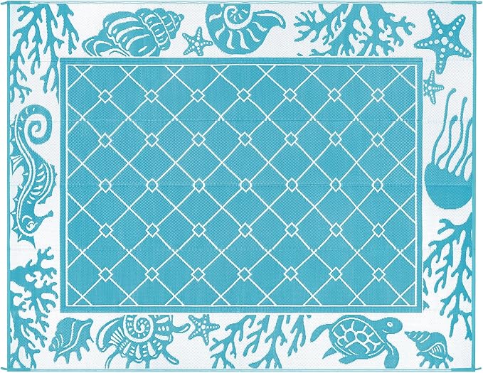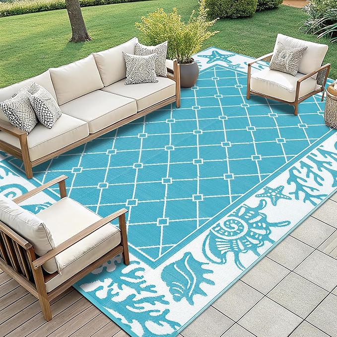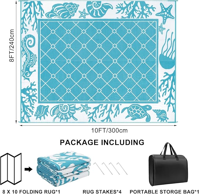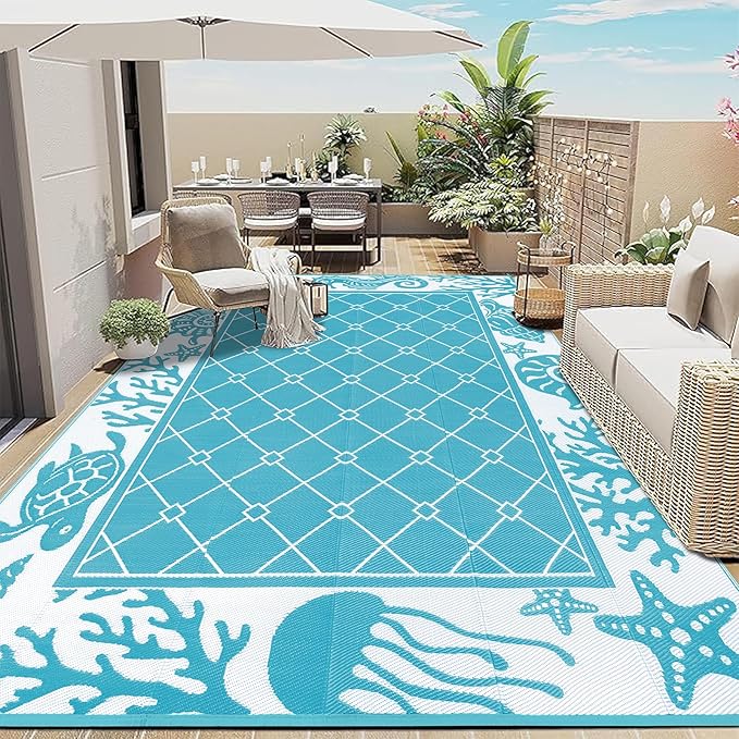 Vaukki Reversible Rugs, Plastic Straw Outdoor Doormat, Fade Resistant Plastic Outdoor Patio Mat, Lightweight Ocean Area Carpet for Patio, RV, Camping, Beach, Deck, Backyard and Picnic (Teal, 8'x10')
