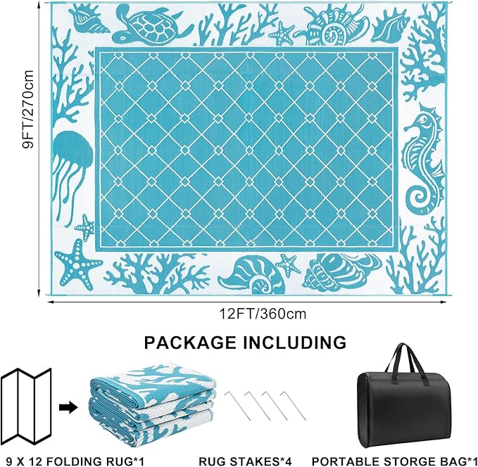 - Plastic Outdoor Rugs: The patio rug is made of premium plastic straw materials. The RV mat for outdoor is durable and modern. The outdoor patio rug measures 9 X 12 feet, which is wide and big enough for daily use
