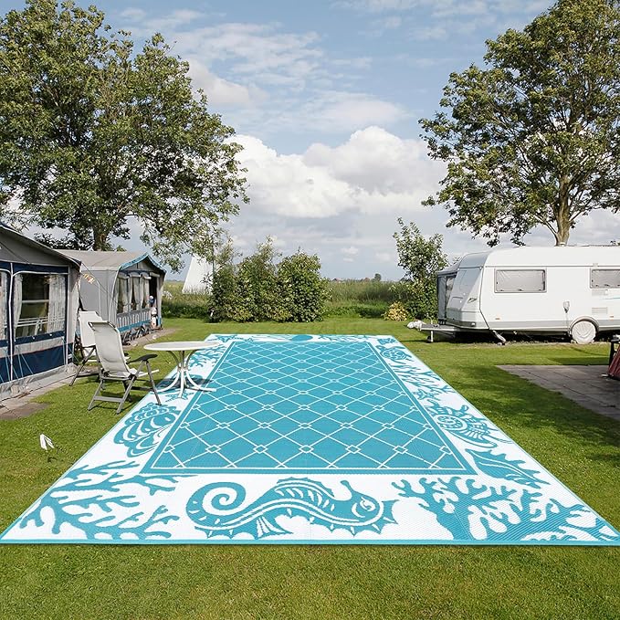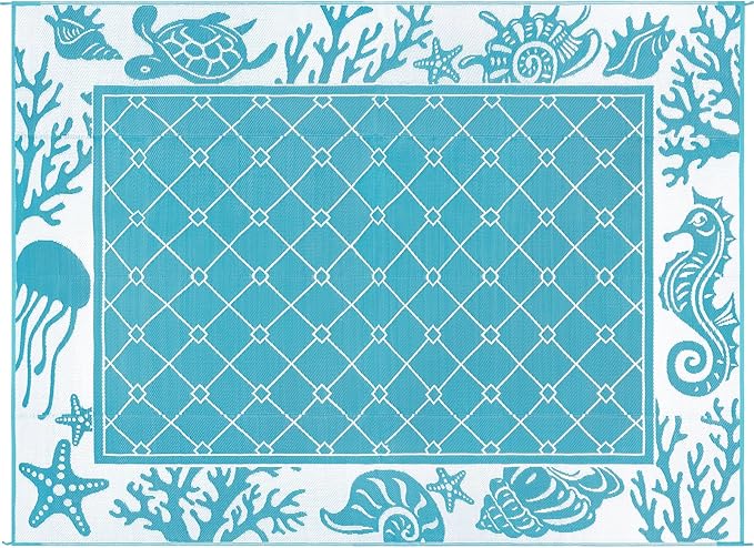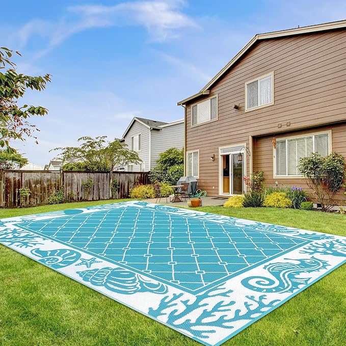 Vaukki Reversible Rugs, Plastic Straw Outdoor Doormat, Fade Resistant Plastic Outdoor Patio Mat, Lightweight Ocean Area Carpet for Patio, RV, Camping, Beach, Deck, Backyard and Picnic (Teal, 9'x12')