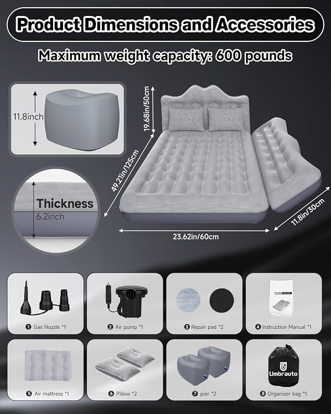 - Heavy-Duty Support: Built to accommodate up to 600 pounds, this car camping air mattress offers a sturdy and spacious sleeping area for solo travelers or companions. Designed for durability and comfort, it ensures reliable support throughout your adventures, making every trip restful and worry-free.