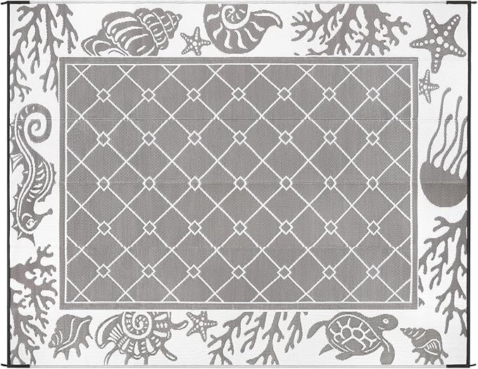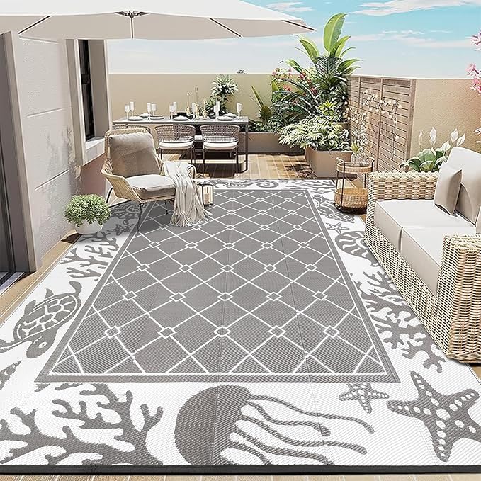 Vaukki Reversible Rugs, Plastic Straw Outdoor Doormat, Fade Resistant Plastic Outdoor Patio Mat, Lightweight Ocean Area Carpet for Patio, RV, Camping, Beach, Deck, Backyard and Picnic (Grey, 8'x10')