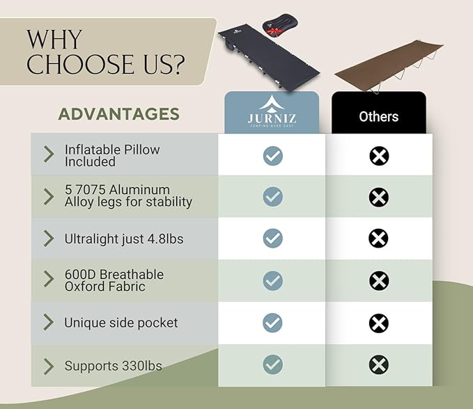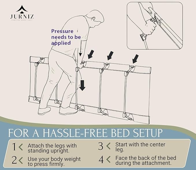 - 🏕️ TAKING YOUR FAMILY CAMPING? Add comfort to your packing list. Load a JURNIZ camping bed for everyone. Feel the difference as you sleep above rather than on the ground. Stretch out on this elevated cot and enjoy a cozy night sleeping in nature, with soft breezes, water rippling in the nearby river, and fresh scents of the forest.