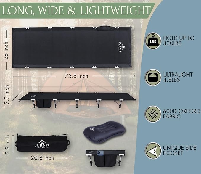 - 💤 AN INCREDIBLE NIGHT’S SLEEP OUTDOORS: After a long, hard day of hiking through thick woods, conquering steep mountains and rugged terrains, you need and deserve a super comfortable night’s rest. The JURNIZ camping cot and camping pillow await, ready to transport you to dreamy sleep so you’re refreshed and energetic for tomorrow’s adventures.