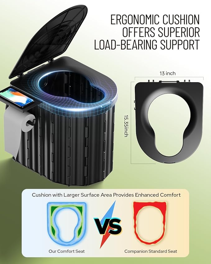 - ERGONOMIC CAMPING TOILET- Taller, larger, and foldable for portability. Designed with a seat cushion specifically for the American body, offering a larger contact area for enhanced comfort. Includes trash bags and liquid solidifier to effectively deodorize and clean urine and feces.