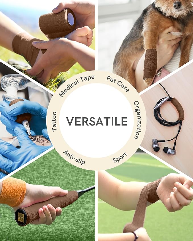 FriCARE Self Adhesive Bandage Wrap, Medical Tape in First Aid Kit, Cohesive Bandages for Wounds Sport Vet, FSA/HSA Eligible, 2 Inches X 5 Yards 6 Rolls, Dark Brown