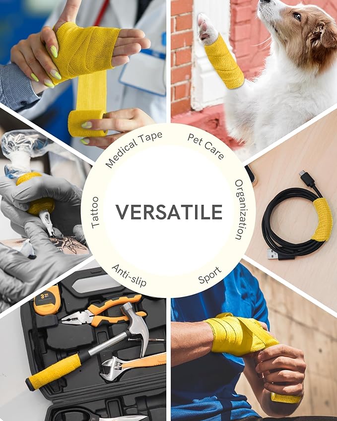 FriCARE Self Adhesive Bandage Wrap, Medical Tape in First Aid Kit, Cohesive Bandages for Wounds Sport Vet, FSA/HSA Eligible, 2 Inches X 5 Yards 6 Rolls, Yellow