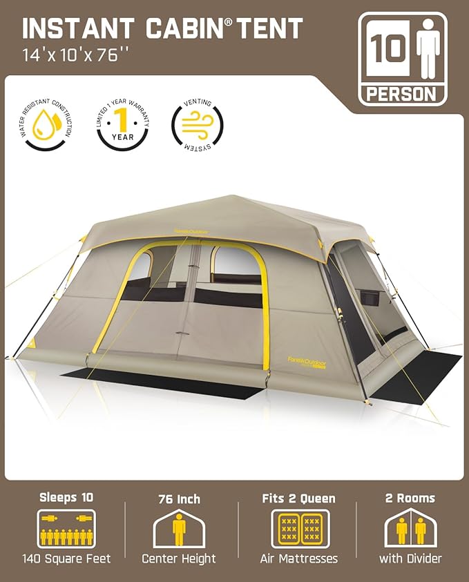 - Spacious & Flexible Layout: Measuring 14 x 10 feet with a height of 76 inches, this camping tent offers a spacious interior that can comfortably accommodate multiple family members or friends. It includes a zippered divider that easily splits the tent into two 70-square-foot rooms, providing more privacy and flexibility