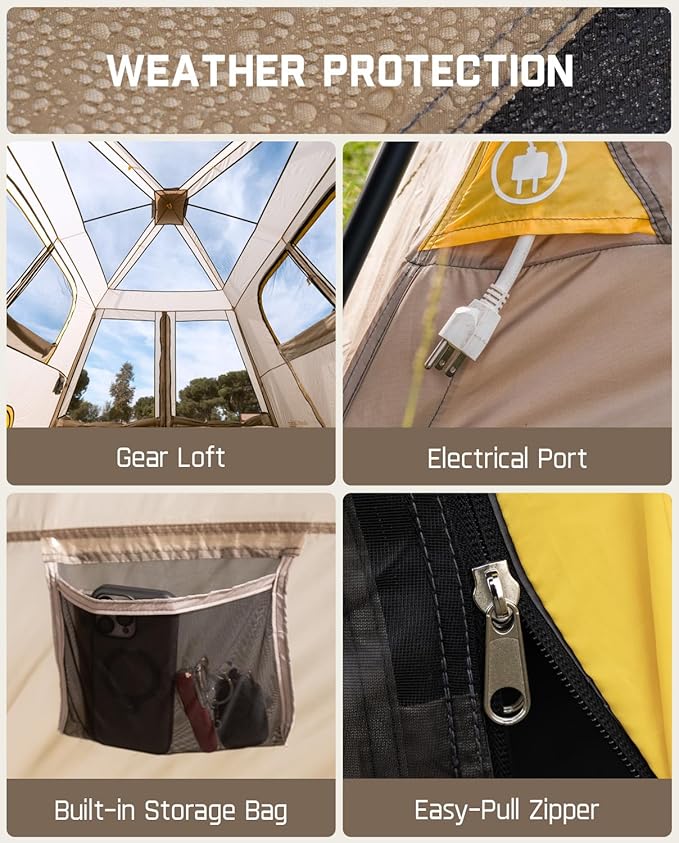 - All-Weather Protection: This tent for camping equipped with extra steel stakes to ensure the tent is firmly secured, it also includes a removable rainfly to protect you from wind and rain. The tent features sealed seams and unique waterproof strips that enhance overall waterproof performance