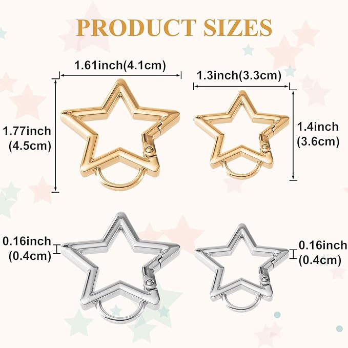 - Package Contains: You will receive 4 pcs zinc alloy star shaped carabiner in total. It contains 2 sizes: big and small. The bigger size is 1.61 x 1.77 in (4.1 x 4.5 cm), the smaller size is 1.1 x 1.4 in (3.3 x 3.6 cm), and the thickness is 0.16 in (0.4 cm). These 2 styles are enough for your daily use