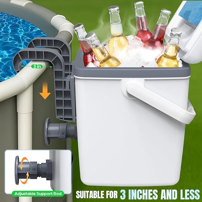 - š§ćConvenient Poolside Cooler & Portableć - This poolside cooler is designed with a 3-inch poolside hook (Tips: The hooks are suitable for Pool liner less than 3 INCHES). The small cooler hard shell for above ground pool accessories can be fixed to above ground pool. To provide easy access to cold beverages, snacks, and refreshments while lounging by the pool. No need to leave the pool area to fetch drinks or snacks. The portable handle allows you to add drinks conveniently and use outdoors.
