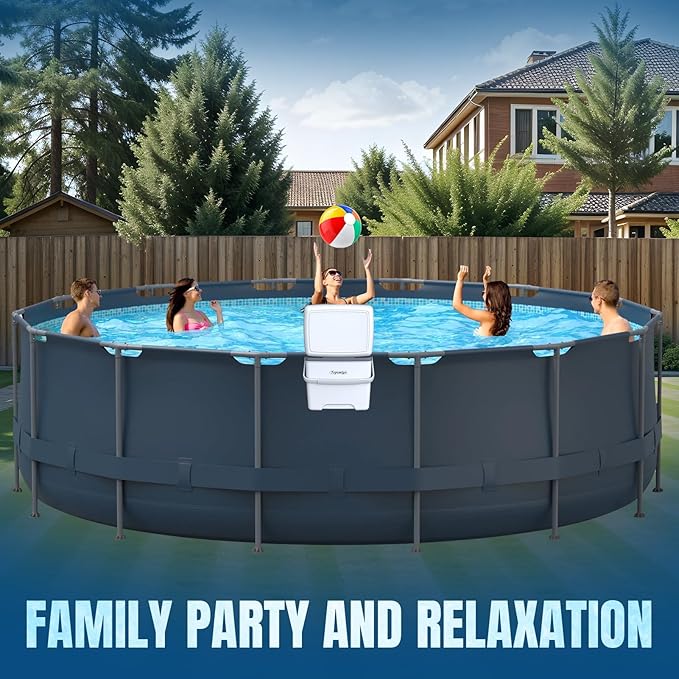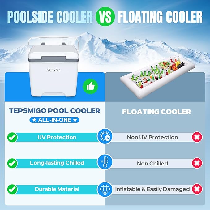 - š§ćUV-Resistant & Leakproof Designć - Pool cooler for above ground pool made of Heavy-duty PVC material and reinforced seams to prevent cracks and leaks. The sloping lid design blocks water splashes and UV damage for outdoor durability. Compared with traditional floating poolside cooler that need to be inflated and damaged, our above ground pool cooler for above ground pool accessories is durable and UV-resistant, making it safer to use.
