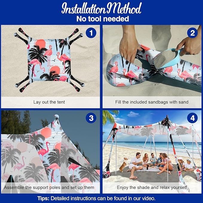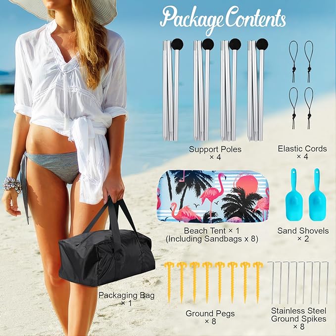 - đ§ăQuick and Easy SetupăIt only takes a few minutes to set up and take down. Spread it out, then fill the sandbags, and add the poles. The included sand shovel is a nice bonus to fill 8 sandbags. Burying sandbags into the beach will make beach shelter more stable. One person can do it, making the outdoor beach day so easy and comfy!