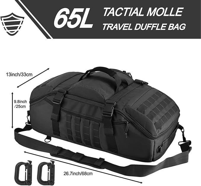 - 【65L Duffle Bag】The tactical bag measures 26.7 x 13 x 9.8 inches -68 x 33 x 25cm, with a large capacity design of 65L. It can be attached with a front velcro patch and can be disassembled to customize your duffle bag according to your needs. Easy to load essential items for sports and travel, designed as a storage tool for sports and travel enthusiasts.