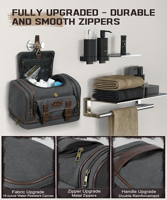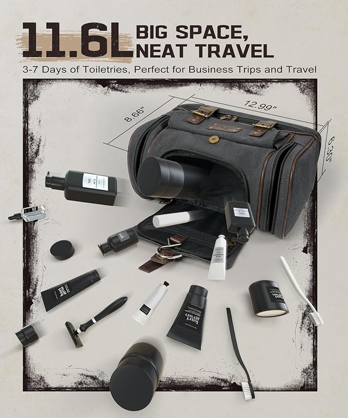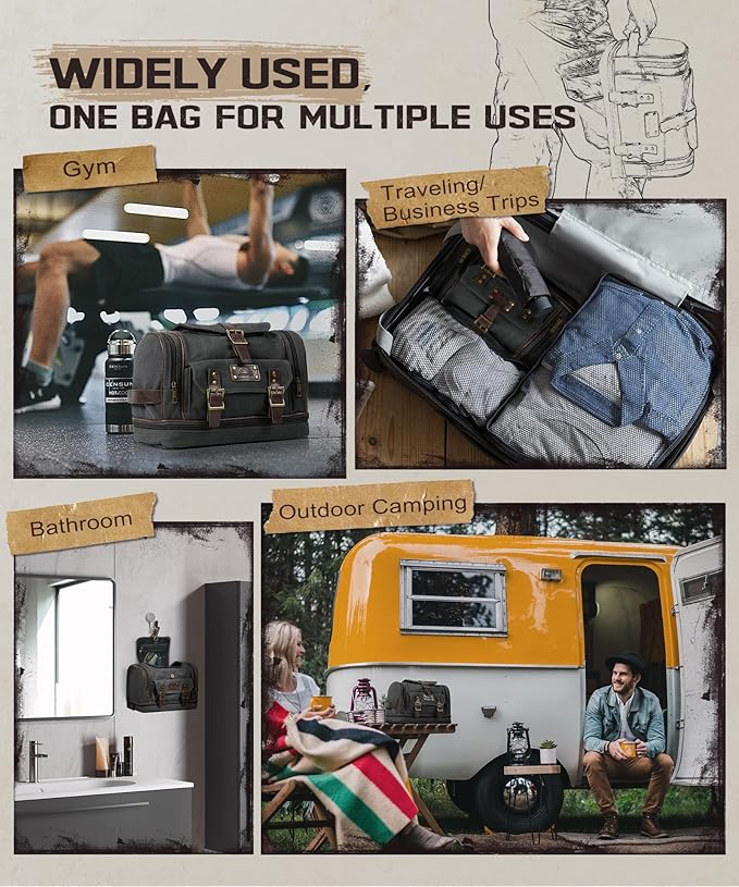 - 【Durable Materials】This mens toiletry bag is made of 16oz washed canvas and PU oil-tanned leather, with a premium vintage texture. The body of the travel toiletry kit is shaped with EVA, which makes the bag strong, sturdy and not easy to deform. The travel pouches for toiletries main pocket has a sturdy metal double zipper to ensure a smooth opening. The front pocket is reinforced with double stitching, more sturdy and durable.