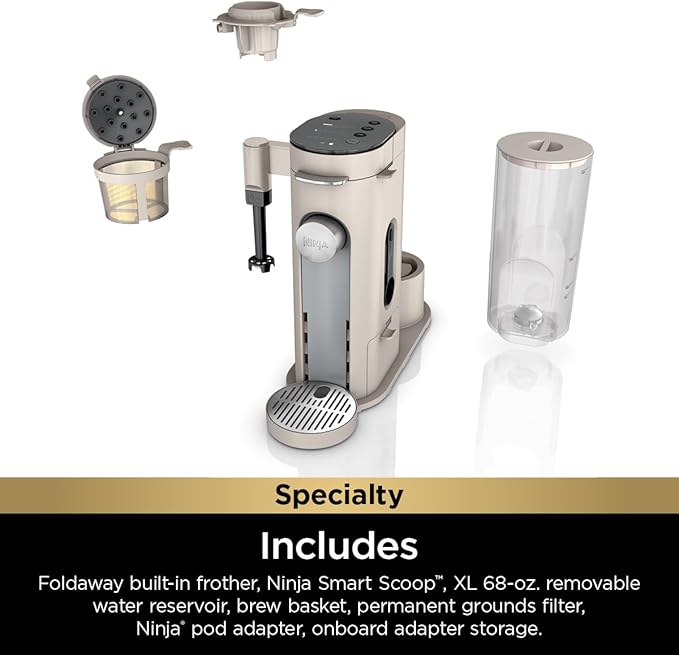 Ninja Pod & Grounds Specialty XL Single-Serve Coffee Maker, K-Cup Pod Compatible, Brews Grounds, Compact Design, Built-In Milk Frother, 68-oz. Reservoir, 6-oz. Cup to 24-oz. Mug Sizes, Stone, PB055AST