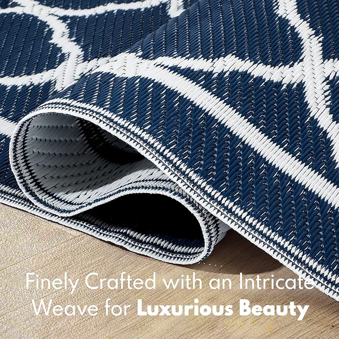 Waterproof Outdoor Rug 9x18 ft, Reversible Plastic Straw Rug, Easy to Clean Patio Rug, Portable Carpet for Patio, RV, Deck, Balcony, Backyard, Picnic, Beach, Clover, Navy Blue