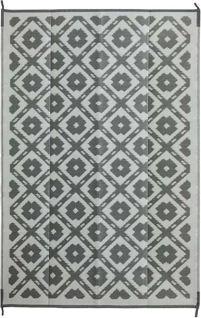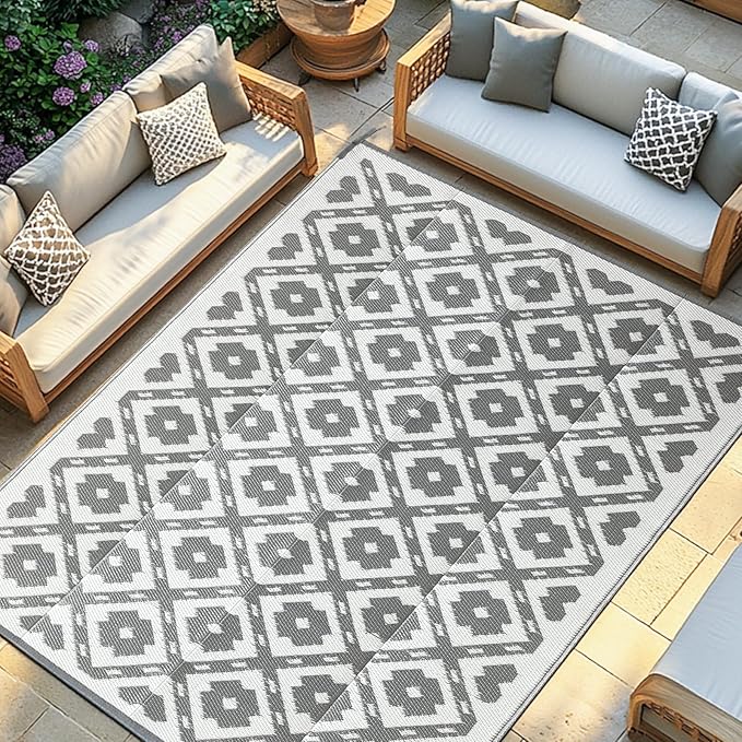 Waterproof Outdoor Rug 6x9 ft, Reversible Plastic Straw Rug, Easy to Clean Patio Rug, Portable Carpet for Patio, RV, Deck, Balcony, Backyard, Picnic, Beach, Square Dashed, Gray