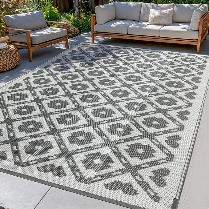 Waterproof Outdoor Rug 9x12 ft, Reversible Plastic Straw Rug, Easy to Clean Patio Rug, Portable Carpet for Patio, RV, Deck, Balcony, Backyard, Picnic, Beach, Square Dashed, Gray