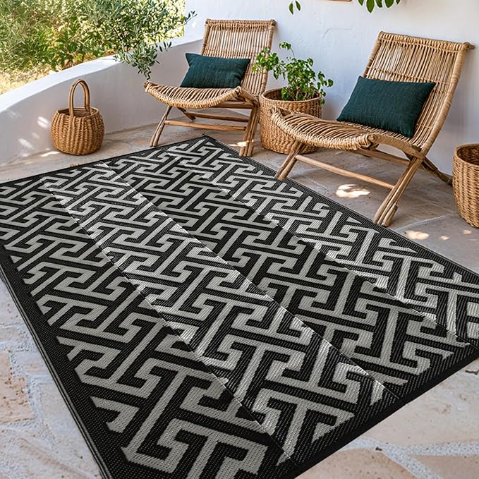 Waterproof Outdoor Rug 4x6 ft, Reversible Plastic Straw Rug, Easy to Clean Patio Rug, Portable Carpet for Patio, RV, Deck, Balcony, Backyard, Picnic, Beach, I-Shaped, Black