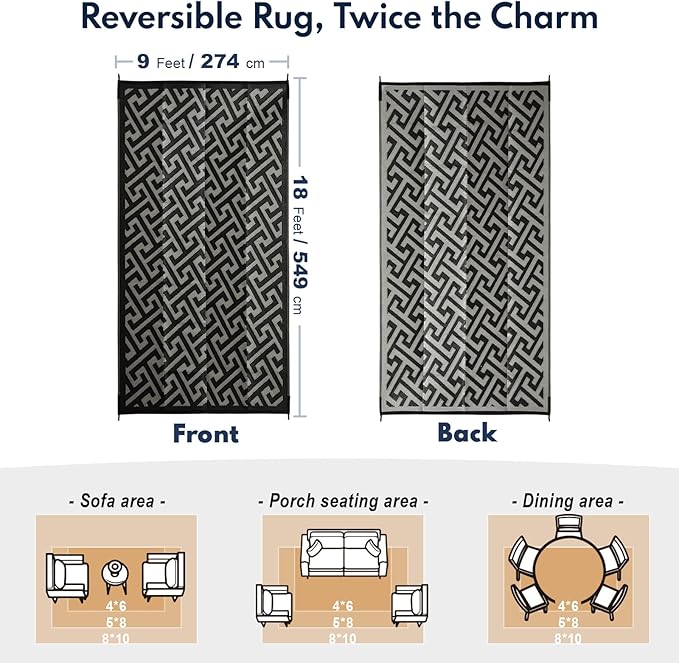 Waterproof Outdoor Rug 9x18 ft, Reversible Plastic Straw Rug, Easy to Clean Patio Rug, Portable Carpet for Patio, RV, Deck, Balcony, Backyard, Picnic, Beach, I-Shaped, Black