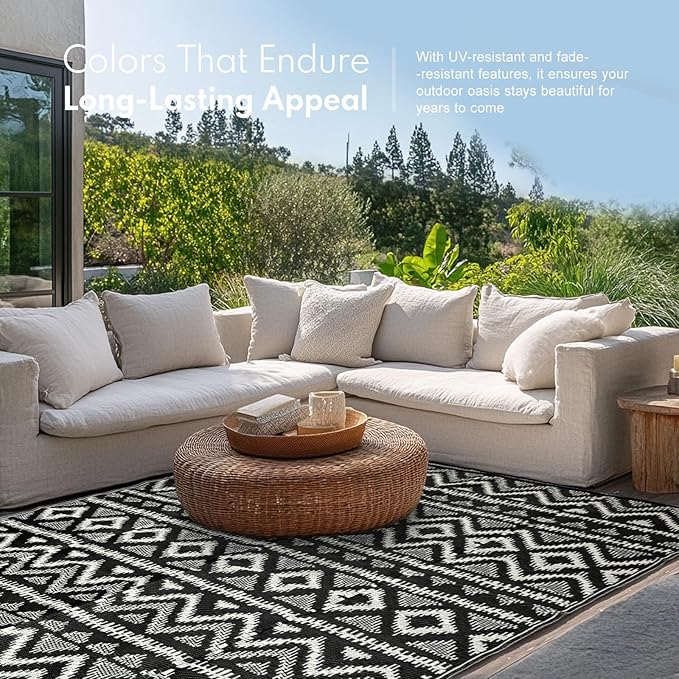- UV-PROTECTED & LONG-LASTING: Imbued with thoughtful design, this outdoor rug features a UV coating that shields it from fading and sun damage, ensuring its colors remain vibrant and its patterns stay crisp. Its tightly woven fabric and bound edges enhance its durability, making it resistant to everyday wear and tear. To keep it looking its best, we recommend minimizing direct sun exposure when the large outdoor rug is not in use