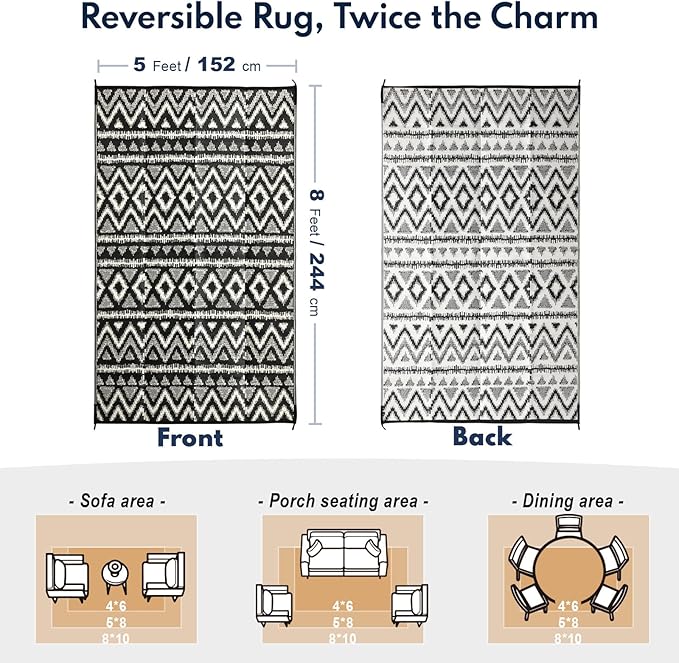 - VERSATILE USE FOR ALL OCCASIONS: Whether you're relaxing on the patio, hosting a picnic, or setting up your RV for a weekend getaway, this outdoor rug is designed to elevate every occasion. It's ideal for both indoor and outdoor settings, bringing a sense of balance and tranquility to any space. The outdoor carpet for patio is very suitable for decks, balconies, beaches, and more