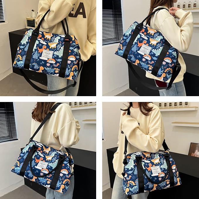 Travel Duffle Bag Weekender Overnight Bag Gym Tote Bag with Wet Pocket for Women Girls Workout Duffel Bag Water Resistant (B-Dinosaurs)