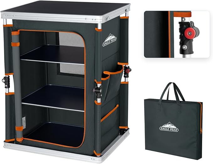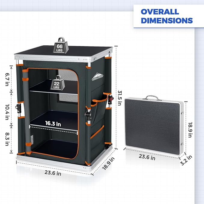 • BREATHABLE & EASY TO CLEAN: EAGLE PEAK portable camping table’s waterproof desktop and the 3 level shelves can be conveniently removed to clean when dirty. 2 mesh backside windows provide breathable airflow. NOTE:the table should not be used in the rain.