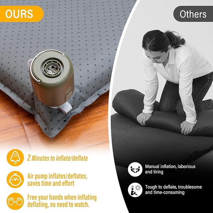 - Quick and Efficient Inflation: No more manual pumping! The external electric pump inflates the vehicle sleeping platform quickly and easily. With 180L/min airflow and 4.5 kpa pressure, the suv mattress camping bed inflates to the perfect firmness in just minutes. Deflation is just as easy with the one-way valve to reduce air leakage.