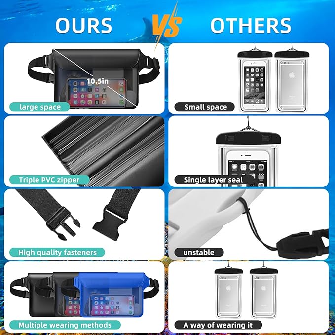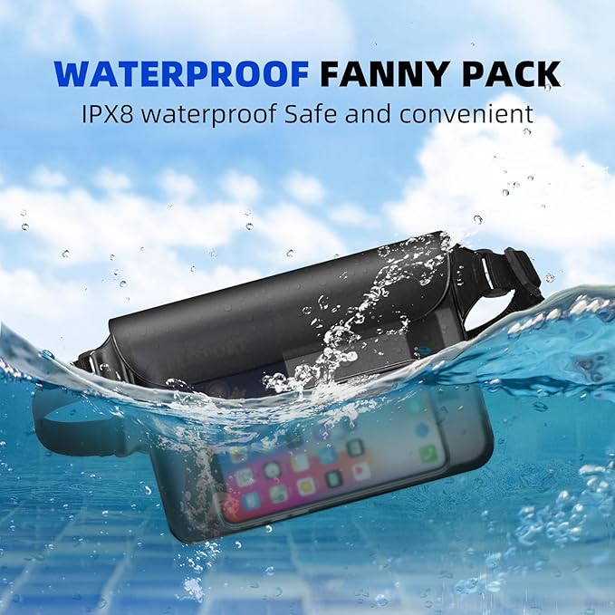 - SAFE AND DURABLE - Waterproof Fanny pack consists of Comfortable and practical PVC material and an adjustable belt to prevent your valuables from being scratched by rocks, sand or branches. The belt can also be used as a shoulder strap, hanging over the shoulders and chest. waterproof cellphone bag Very safe and convenient.