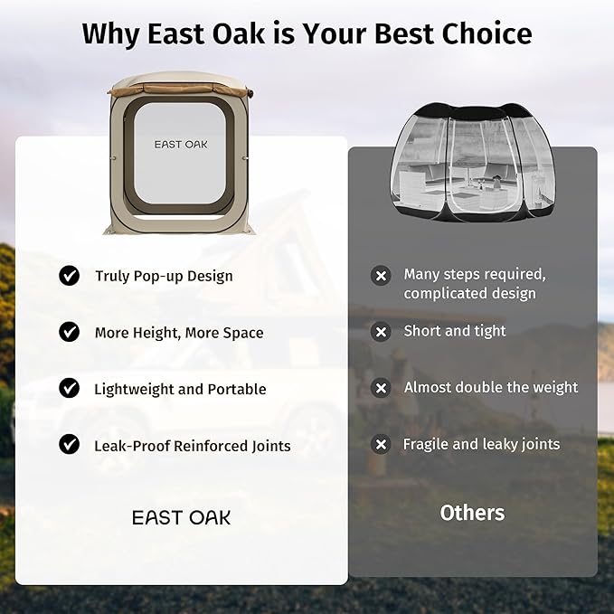 - 𝗩𝗲𝗿𝘀𝗮𝘁𝗶𝗹𝗲 𝗔𝗹𝗹-𝗶𝗻-𝗢𝗻𝗲 𝗧𝗲𝗻𝘁: Engineered for complete outdoor protection, our tent features bug-proof mesh, waterproof walls, and wind-resistant construction. The expandable design offers extra space when needed, while vehicle-connect capability turns your car into a basecamp—delivering 360° coverage for all your adventures. One EAST OAK tent outperforms three ordinary tents.