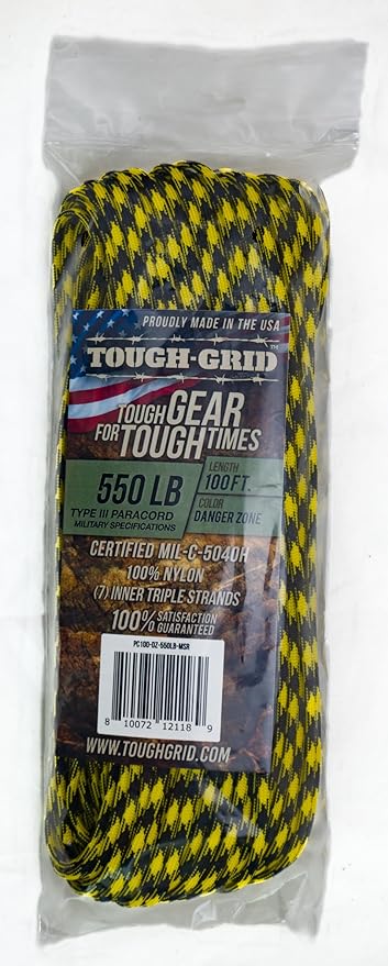 TOUGH-GRID Premium Danger Zone Paracord 550 lbs Made in USA Outdoor Survival Nylon Rope Tactical Heavy Duty Strands Parachute Cord Used by US Military Type III Mil-Spec